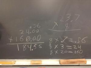 Anyway, I did something similar to that. We are practicing (and practicing and practicing) multiplication, and I threw out a decimal to see what they’d do.  For the most part, they did the problem well, but one little guy solved it, volunteering to show us his thinking.  He’d made an error, but a “good” error (my students get tired of hearing that too – “How can my mistake be good??”) on this problem, one I’d hoped someone would make.  I took a picture of the problem and tweeted it out: