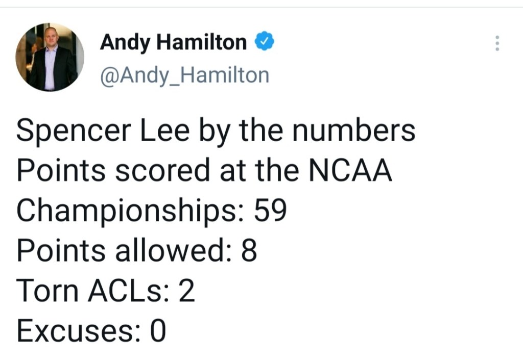 Yes, you heard and read that right. He has not one, but TWO torn ACLs. He’s wrestling on some seriously wonky knees but STILL won a national championship.